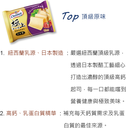 一片芝司樂高鈣起司的鈣質含量比一杯200c.c.鮮奶更高,可幫助骨骼及牙齒成長,加強營養來源。