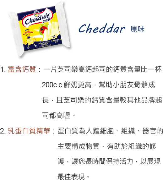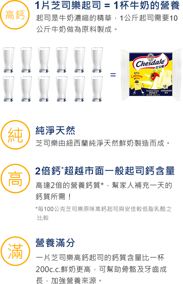 一片芝司樂高鈣起司的鈣質含量比一杯200c.c.鮮奶更高,可幫助骨骼及牙齒成長,加強營養來源。